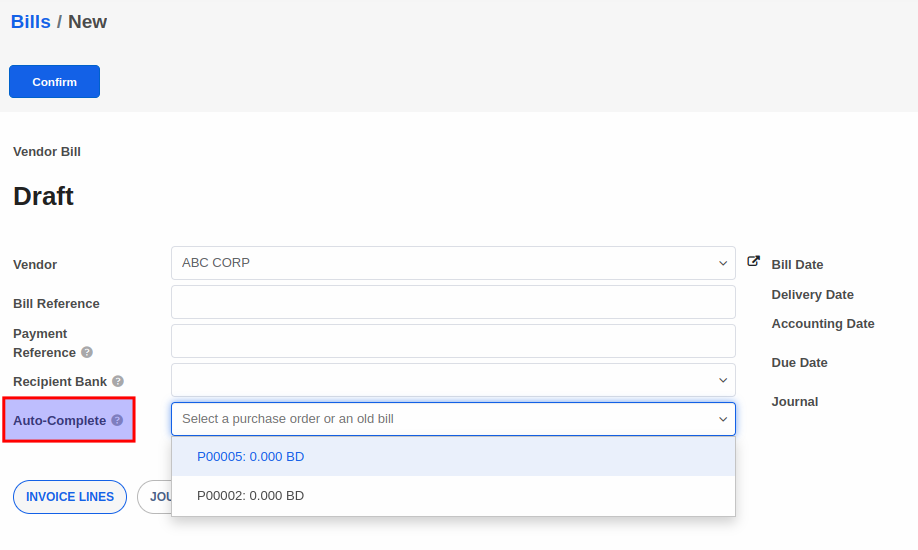 Select a purchase order in the Auto-Complete field. You'll notice that the invoice lines are automatically filled with product lines from the selected purchase order. Note that only order lines/quantities that are not billed yet are fetched.