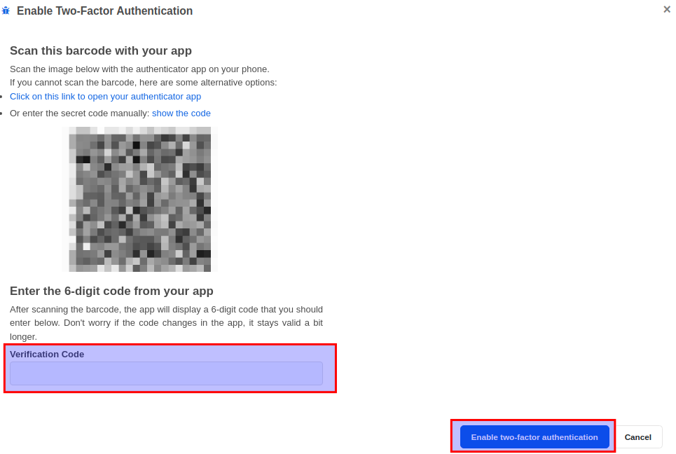 Next, open the Google Authenticator app and scan the barcode that is displayed on your screen. Enter the 6-digit verification code displayed in the Google Authenticator app and click on the Enable two-factor authentication button.