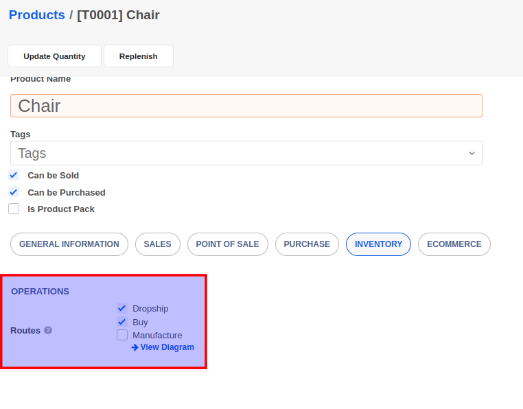 Once you have enabled the dropshipping setting, you will find a new route called Dropship in the product form under the Inventory tab.