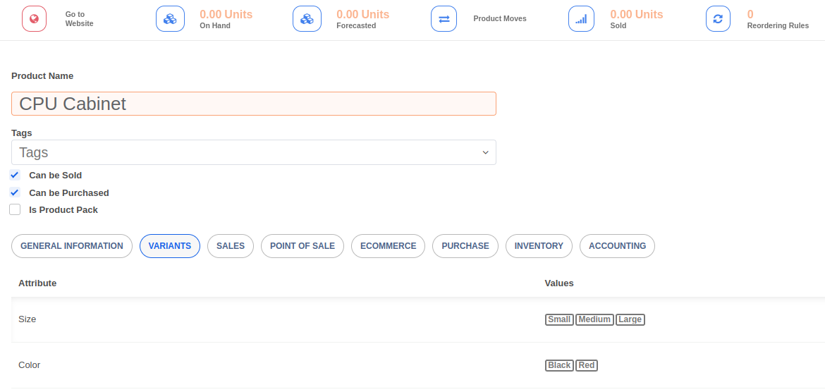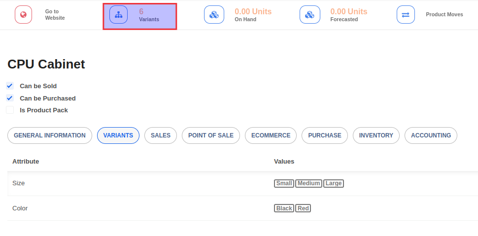 To view the variants linked to a product template, click on the Variants button. You can also see a list of all variants across product templates under the Inventory -> Products -> Product Variants menu.