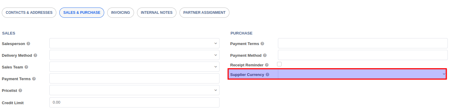 Once you have enabled the multi-currency setting, you can set up a default currency for your vendors. To do this, simply navigate to Purchase -> Vendors, and in the Invoicing/Accounting tab of the vendor form set the Supplier Currency field to the required currency. If the supplier uses the same currency as your company's default currency, then you may leave this field blank.
