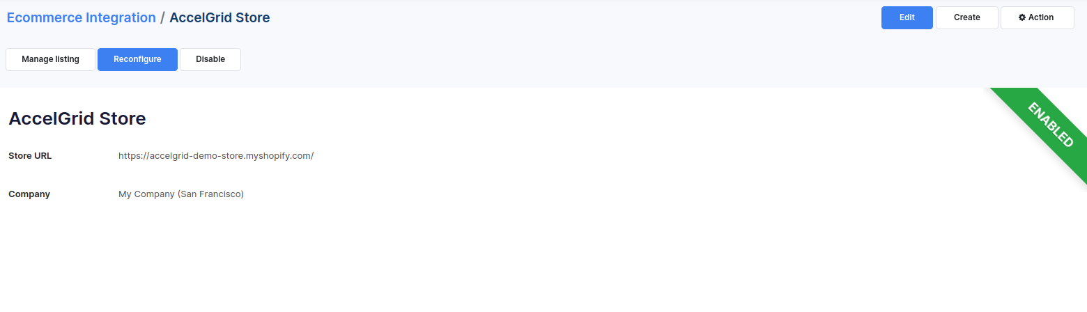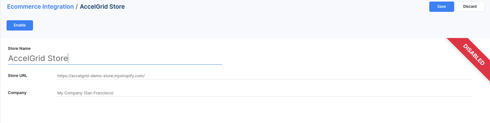 Enter a reference name for the store and the store URL (ex. https://my-store.shopify.com). Click on the Save button and then click on Enable.