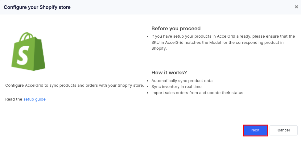 If you have set up your products in AccelGrid already, please ensure that the SKU in AccelGrid matches the Model for the corresponding product in Shopify