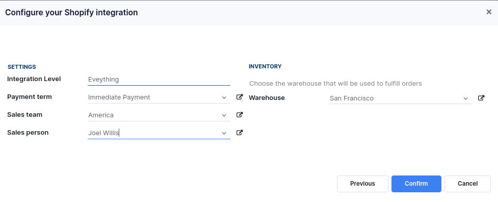 The final step lets you set up the default payment term, sales team, and salesperson to use for orders imported from Shopify. You can also change the Integration Level to Do no pull orders if you want AccelGrid to skip importing orders from Shopify and only sync product and inventory data. This setting is quite useful if you have configured a shipping integration service like ShipStation that is also configured to pull orders from Shopify. Finally, set the warehouse field to the default stock location for fulfilling Shopify orders. Click on the Confirm button.