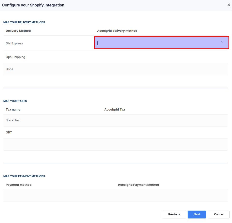 This screen lets you map your Shopify shipping methods, payment methods, and Taxes with AccelGrid. Click on each line and select the record you'd like to map. In some cases, you may need to create new delivery methods, payment methods, and taxes to complete the mapping. You can create new records on-the-fly by using the Create and Edit option that appears when you type into a field. Once you've mapped all the lines, click on the Next button to proceed to the next step.