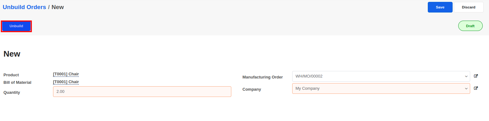 An unbuild order is useful when you need to break down a finished product into its components - in other words, reverse the manufacturing. You can use the unbuild process for products that you have manufactured, as well as for the products you have received. For example, if you have identified a defect in a manufactured product as a result of a faulty component, unbuilding the product will allow you to reuse the other components instead of scrapping the entire manufactured product.