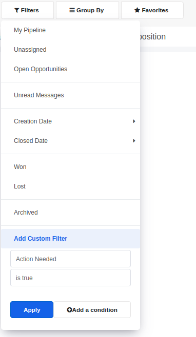 To use the custom filter option, simply select the field and enter the criteria and value for the search. If you wish to add more conditions, click on the Add a condition button. Finally, click on Apply to see the results.