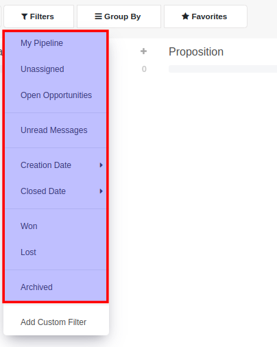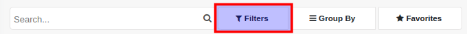 Click on the Filters button when you are on the list or kanban view of the module your wish to perform the search. In the section that appears below the search bar, click on the Filters button.
