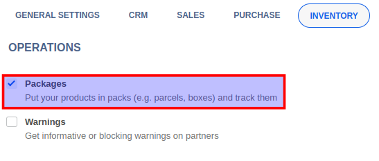 To manage packagings enable the Delivery Packages setting from the Inventory app -> Configuration -> Settings page.