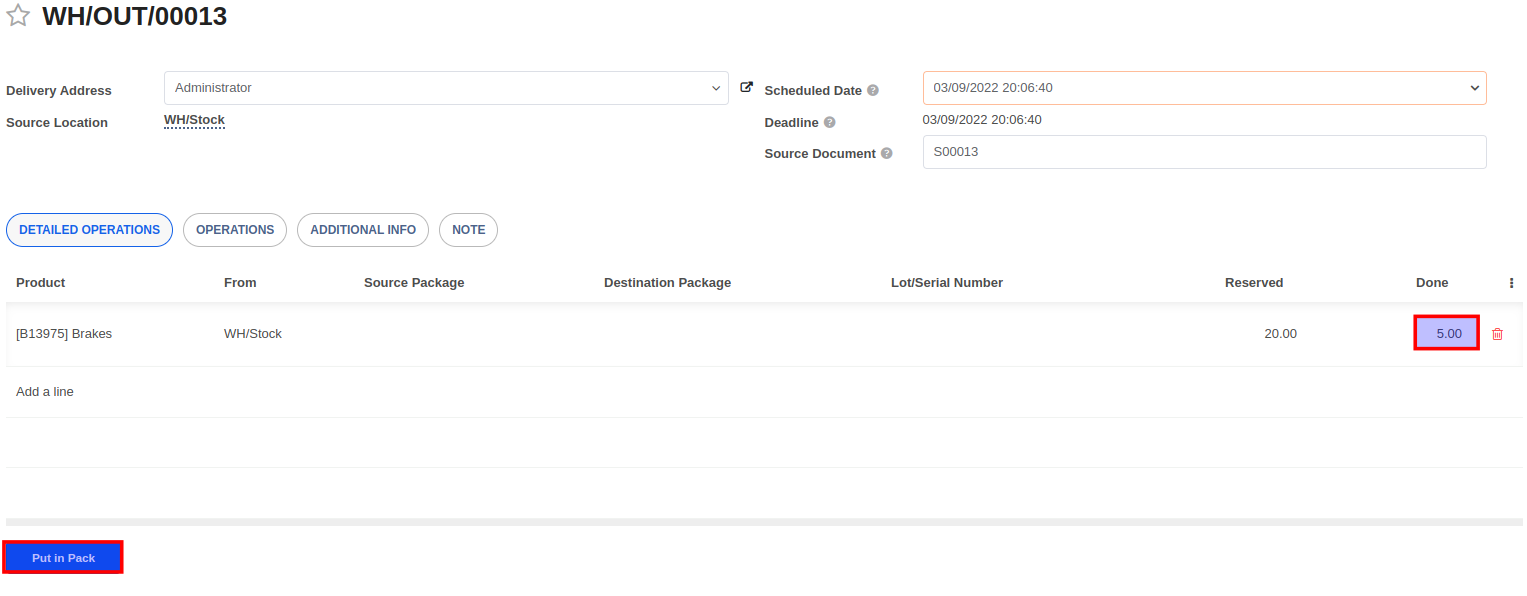An alternative method to put products in packages is to use the Put in Pack button. This method automatically assigns packages to product lines based on the quantity you enter in the Done column. To put products in a package, enter the Done quantities and click on the Put in pack button. If you have entered a Done quantity lesser than the Reserved quantity, a new operation line will be automatically generated for the remaining quantities. You can then repeat the process as needed.