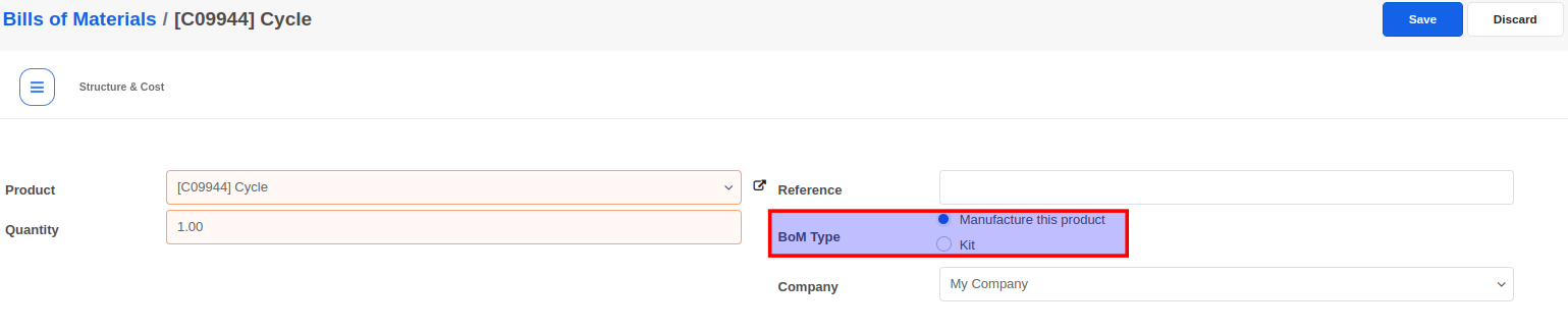 Next, let's create the BoM for the kit using the Manufacturing -> Bill Of Materials menu. The BoM Type must be set to Kit in this case.