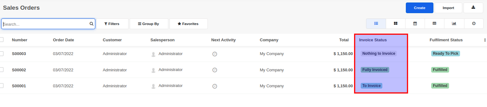 An order can have one of the following three invoice statuses. The invoice status is visible in the order list view and also in the order form view.